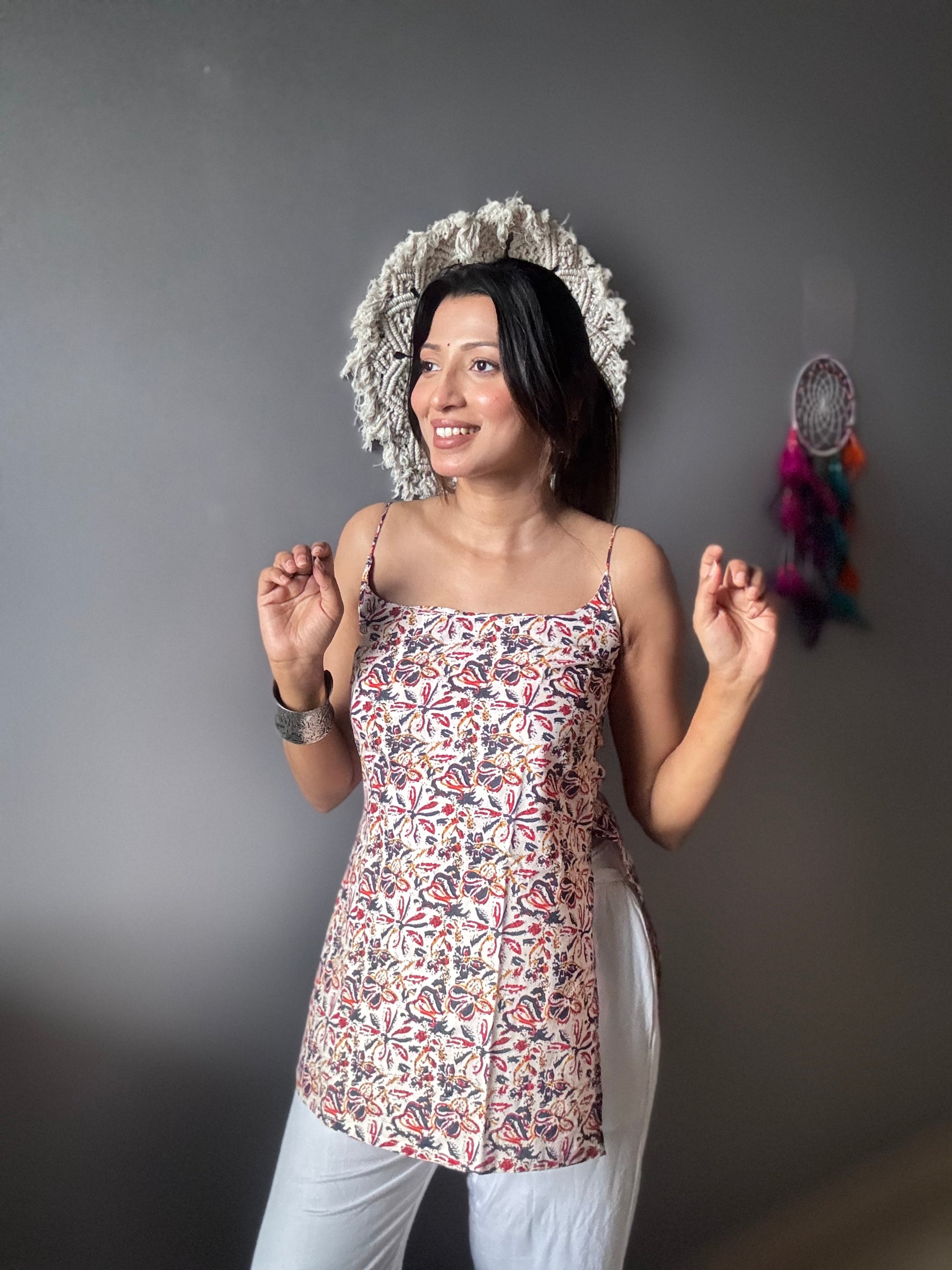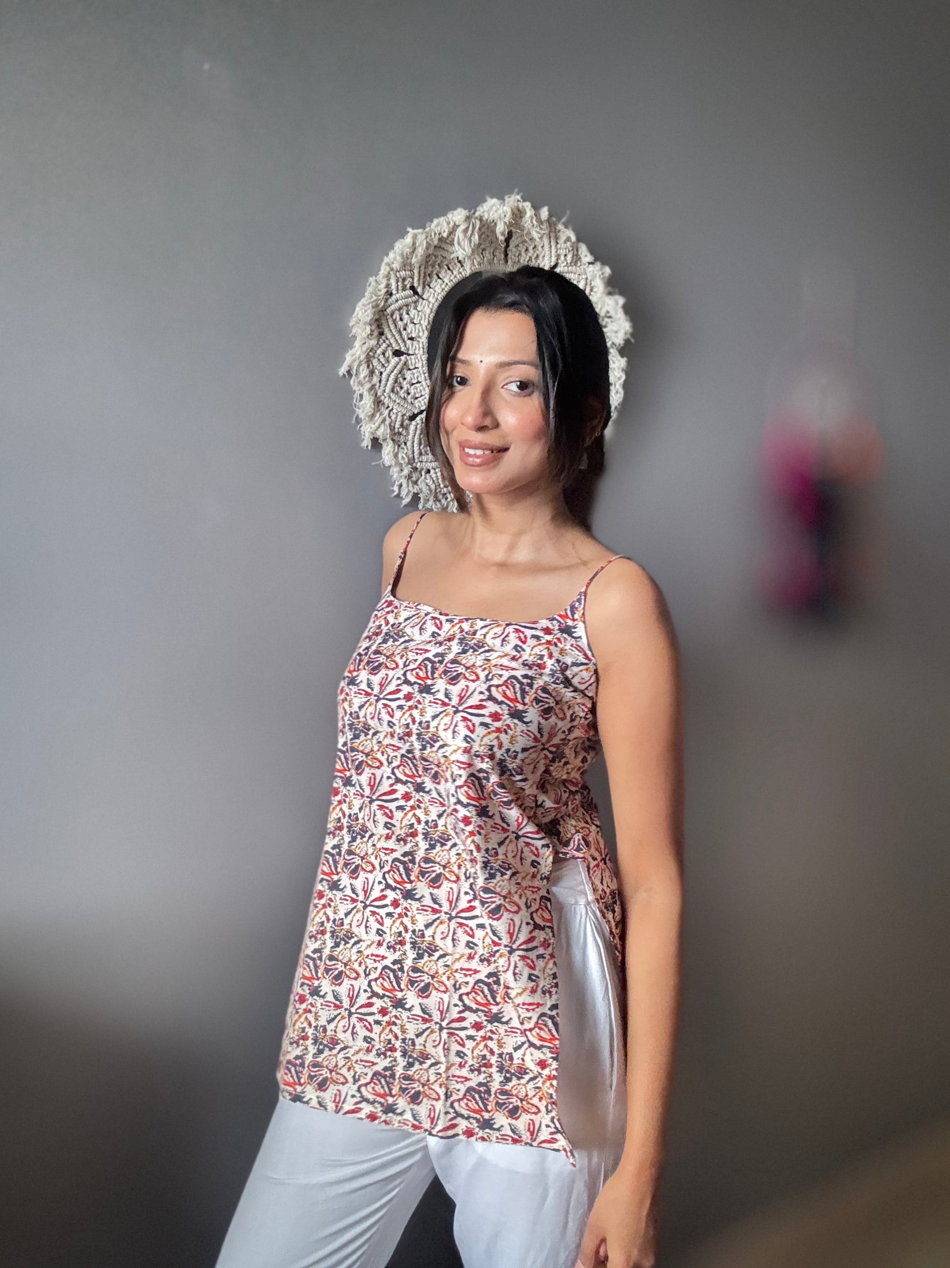 The Ivory Bloom Top is the perfect blend of elegance and modern charm. Made from lightweight cotton, it features a delicate floral hand block print in earthy tones of red, blue, and mustard over an ivory base, giving it a breezy and chic look. The spaghetti straps and square neckline add a touch of sophistication, while the stunning criss-cross tie-up back design makes it a head-turner. Side slits give extra comfort and flow, making it an ideal choice for both casual and festive occasions.