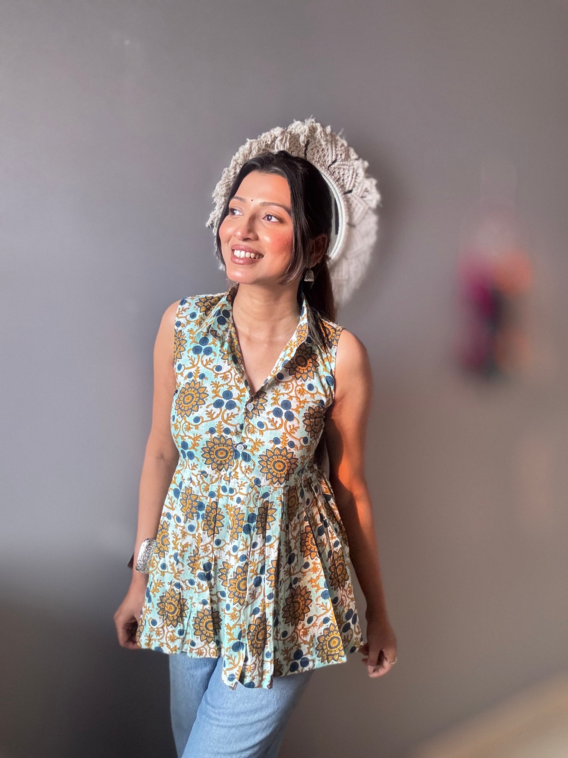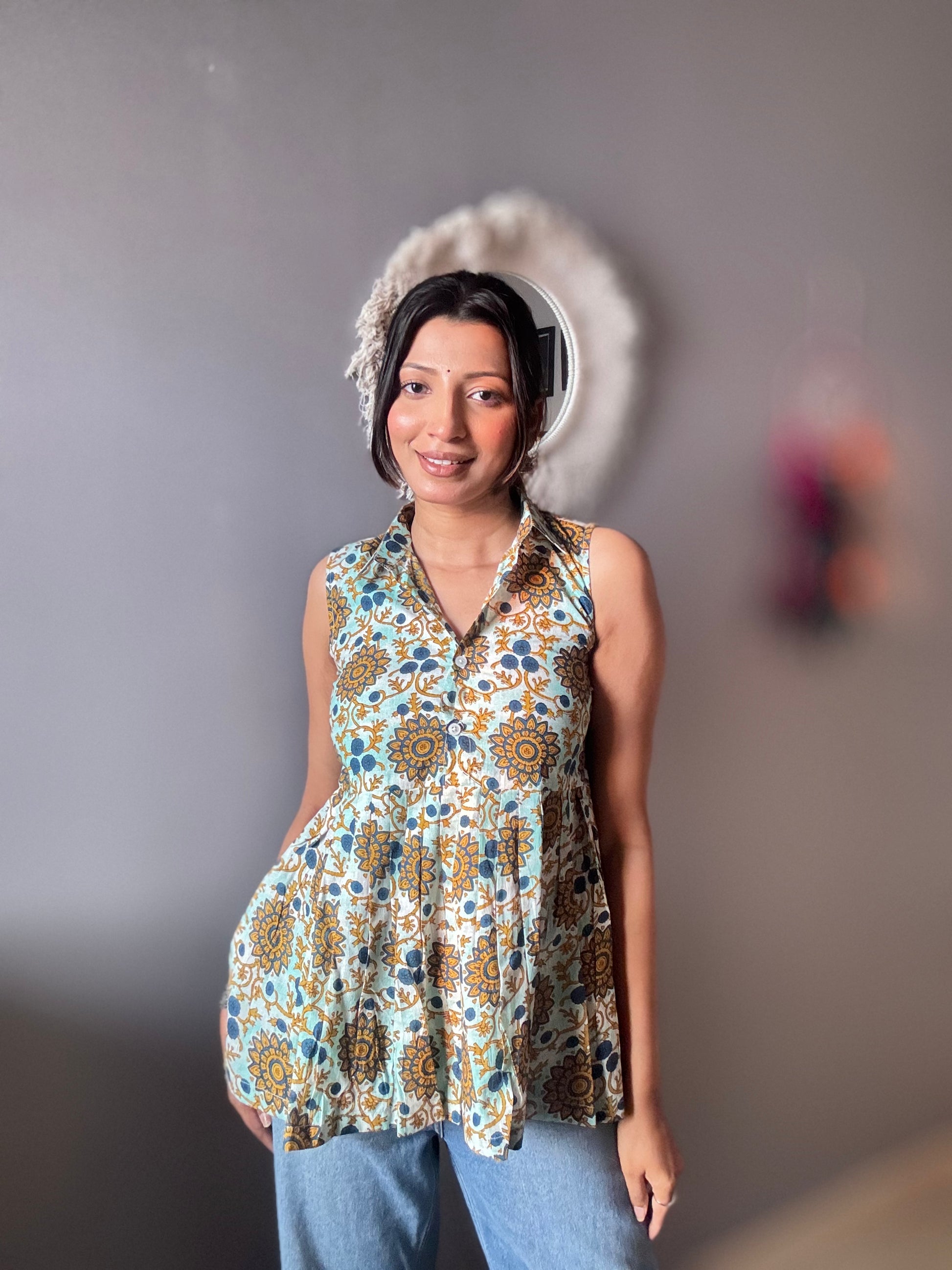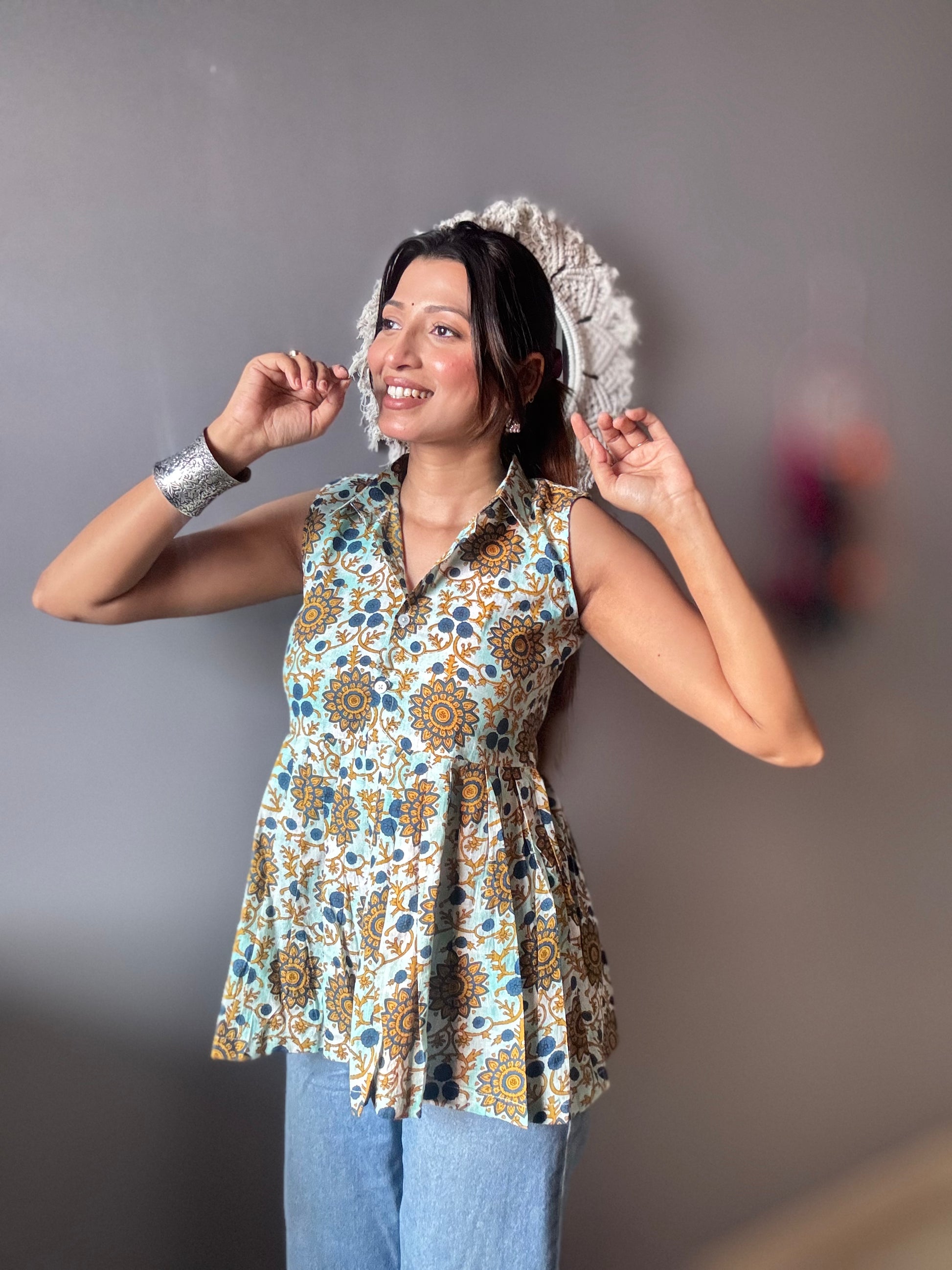 The Mustard Blue Flare Top is a refreshing blend of comfort and style with a vibrant, hand-block inspired floral design. Made from soft, breathable cotton, it features intricate mustard and blue floral motifs over a soothing ivory base. The sleeveless cut, collared neckline, and button-down style add a smart edge, while the flared silhouette creates a breezy, flowy look that flatters all body types. Perfect for day outings, casual get-togethers, or vacation wear, this top is a wardrobe essential that balances elegance with ease.