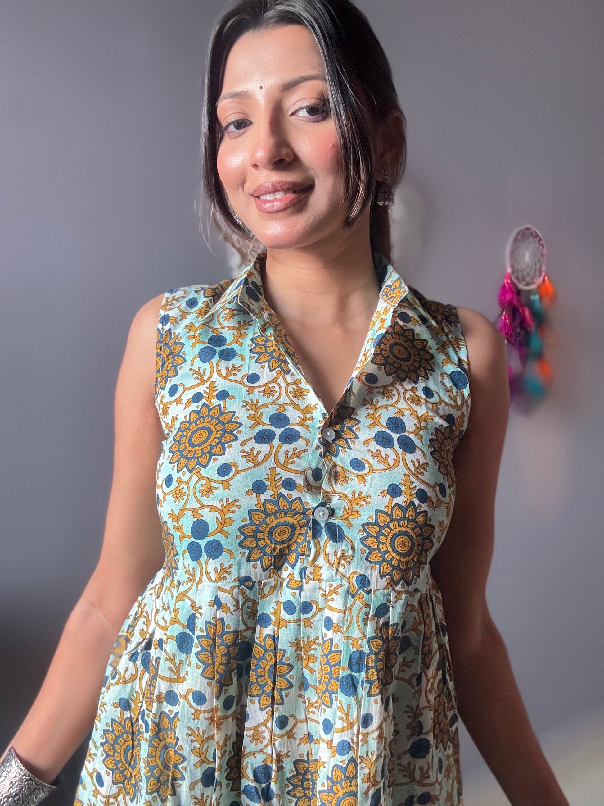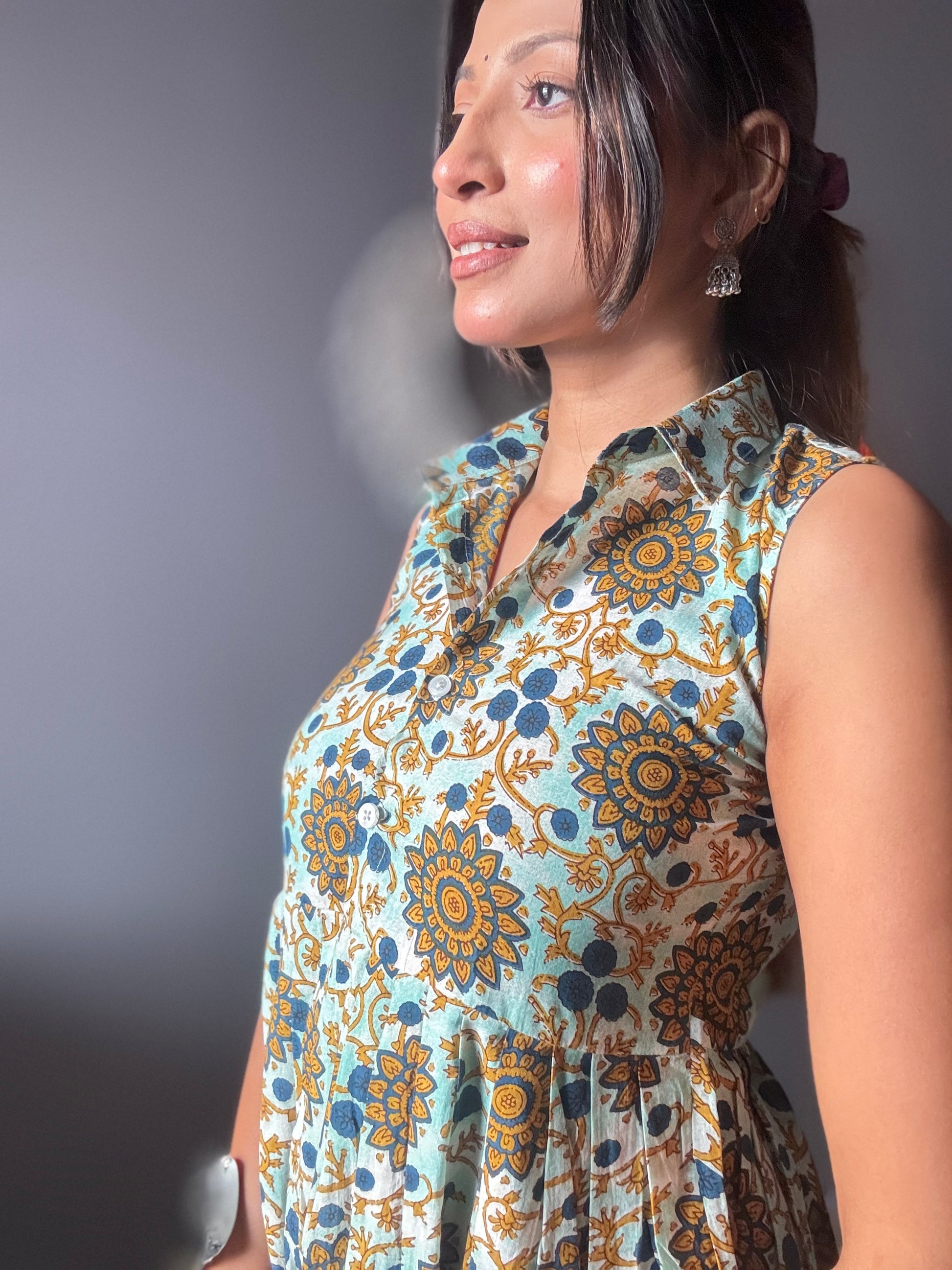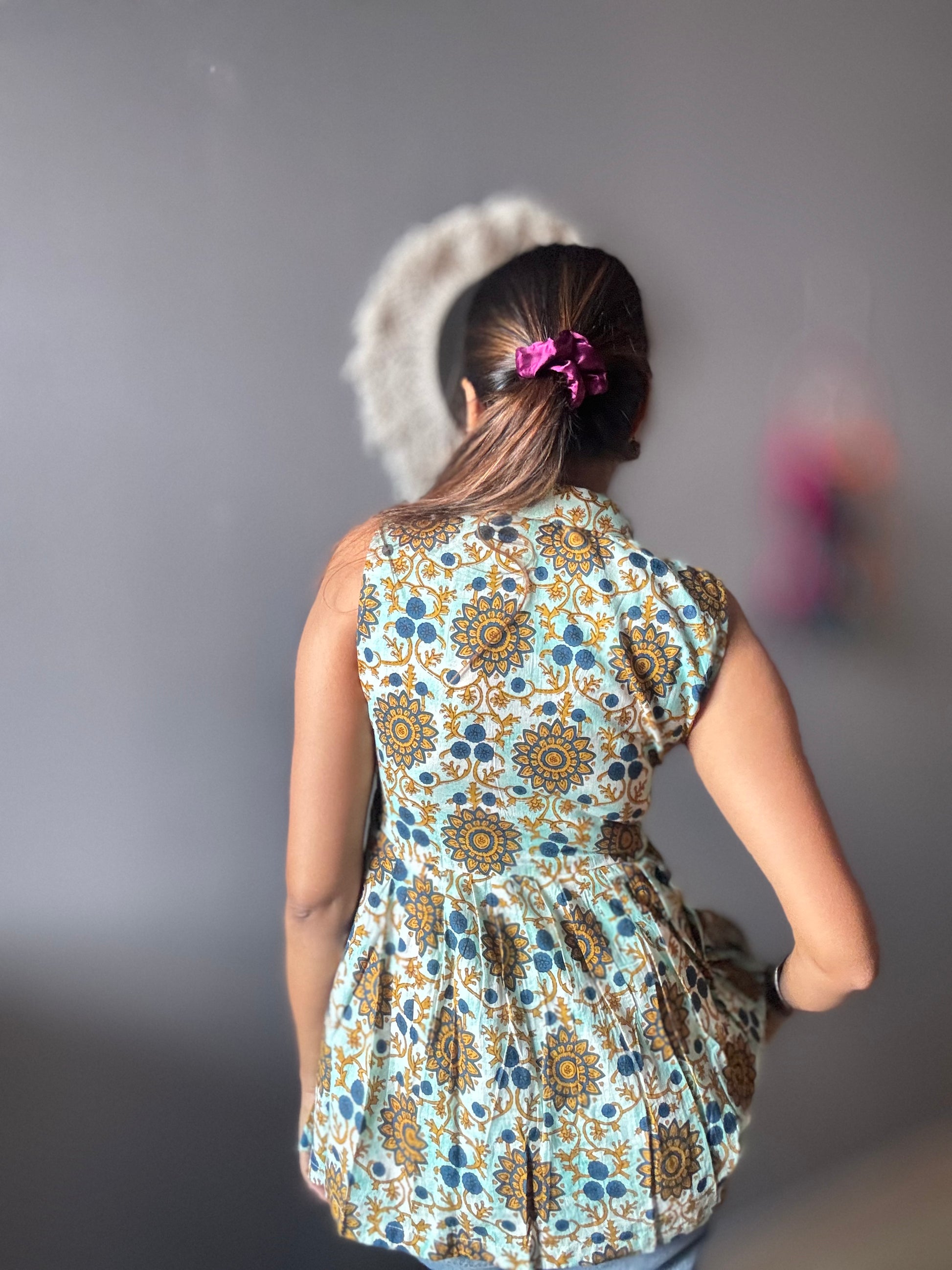 The Mustard Blue Flare Top is a refreshing blend of comfort and style with a vibrant, hand-block inspired floral design. Made from soft, breathable cotton, it features intricate mustard and blue floral motifs over a soothing ivory base. The sleeveless cut, collared neckline, and button-down style add a smart edge, while the flared silhouette creates a breezy, flowy look that flatters all body types. Perfect for day outings, casual get-togethers, or vacation wear, this top is a wardrobe essential that balances elegance with ease.